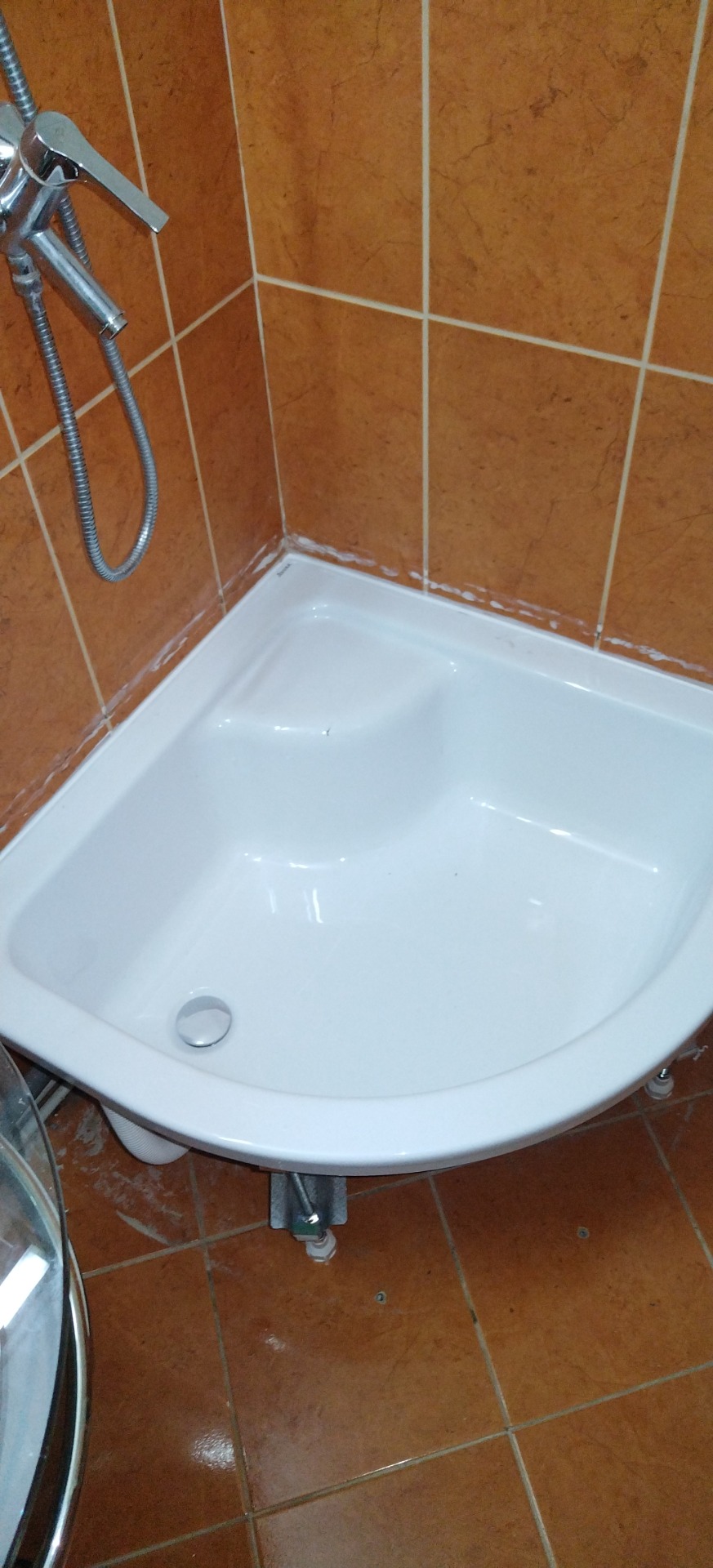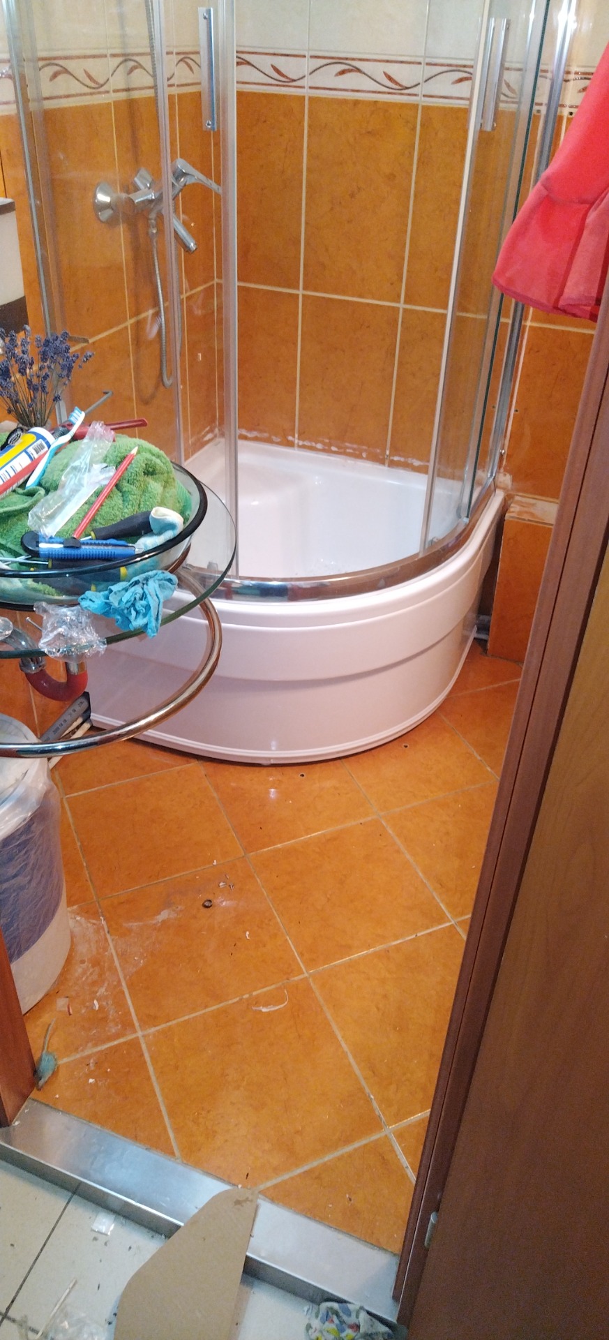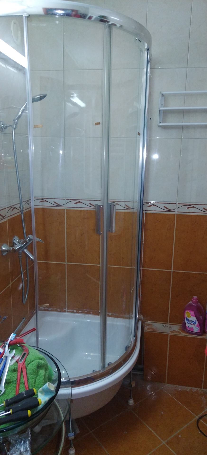 Itt a régi Sanimixes zuhanykabin kiszerelése után, RAVAK zuhanykabin berakás volt. Itt figyelnem kellett arra, hogy kellő magasságban legyek a csőhöz, mivel én nem használok harmónika csövet, hanem csak PVC csövet használok.