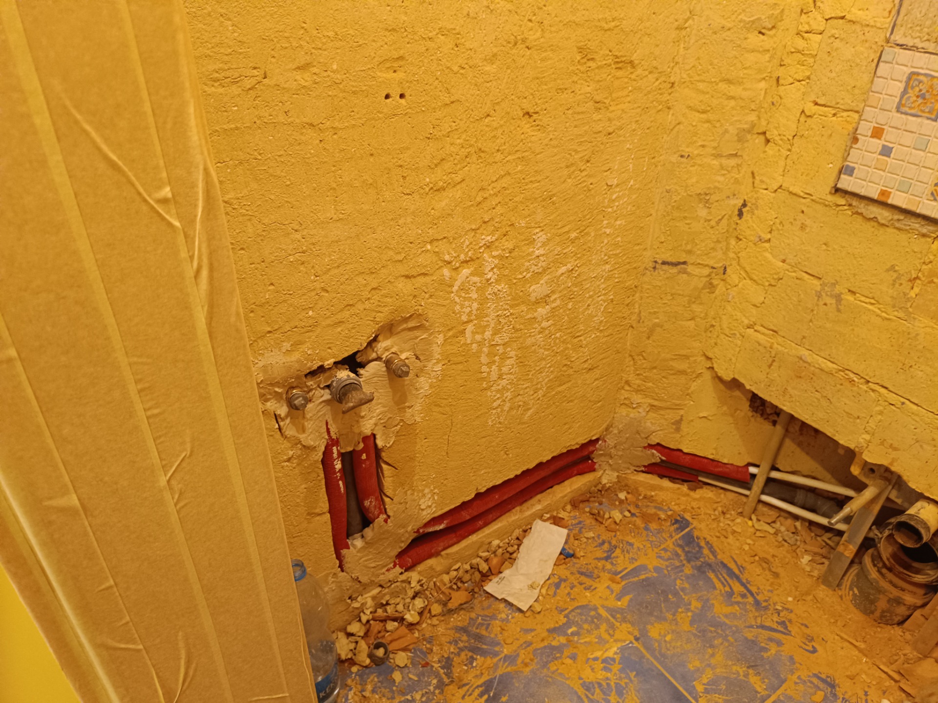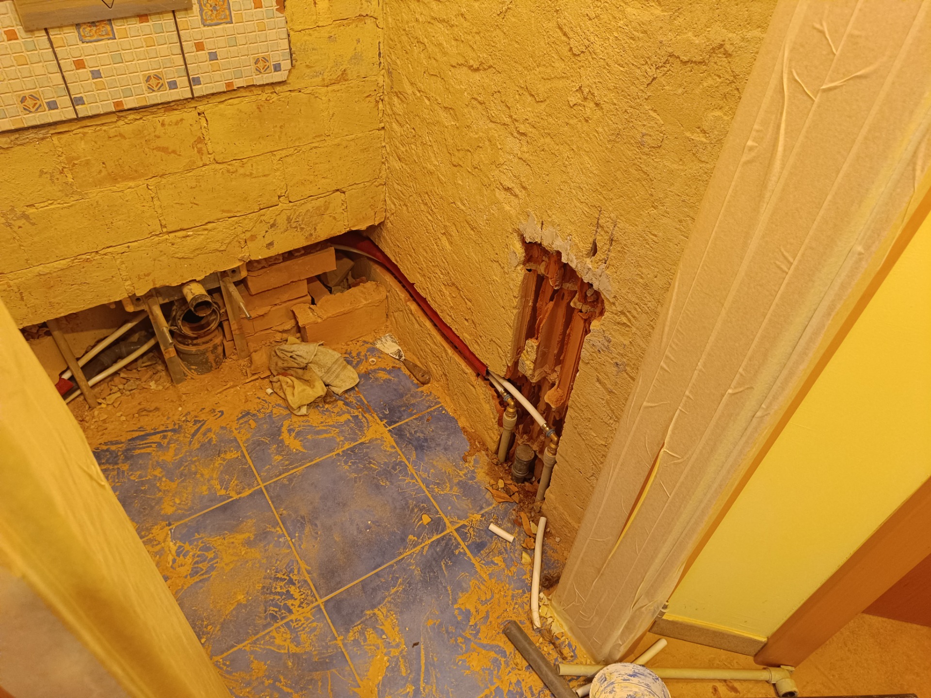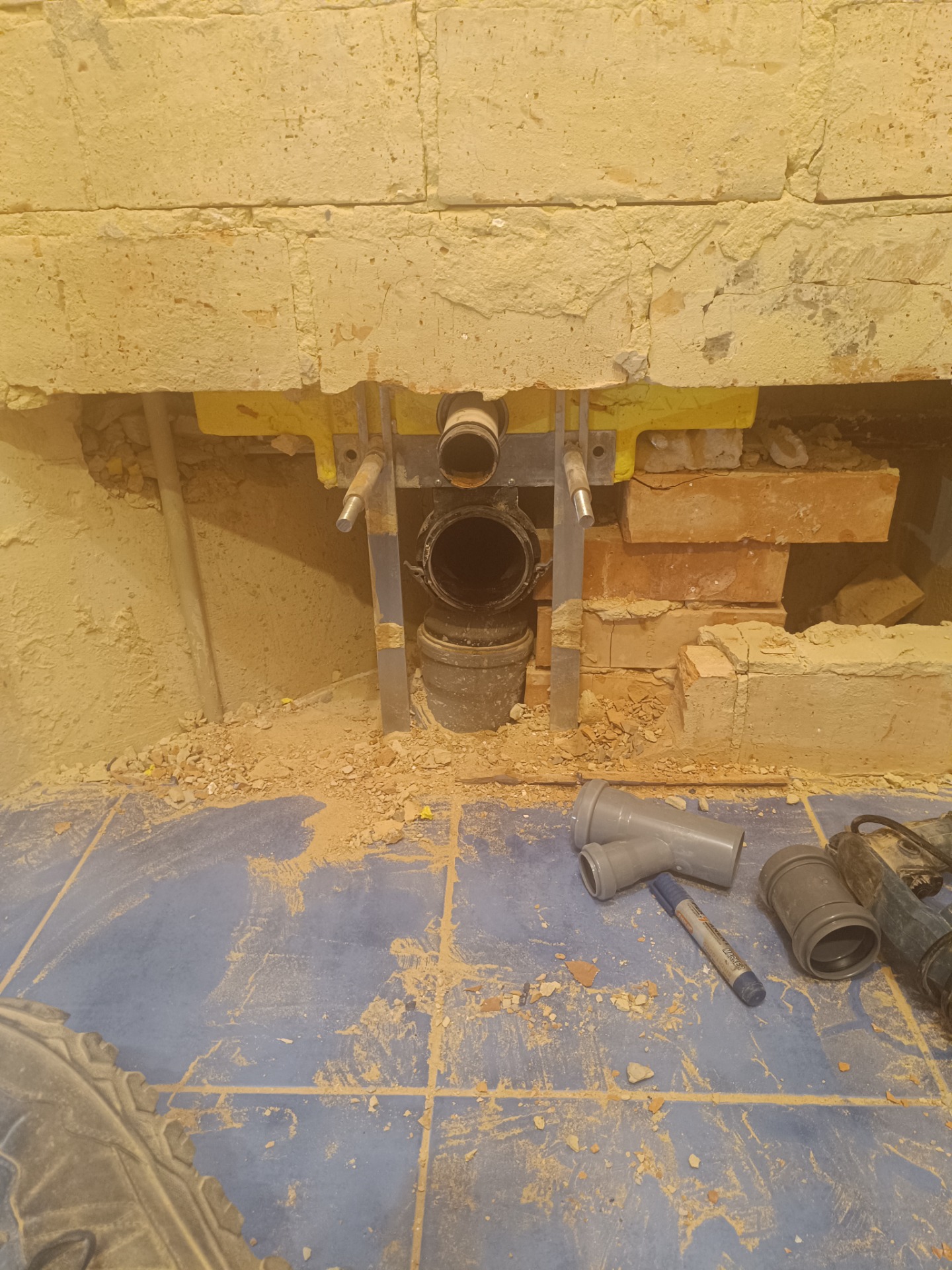 Jobb oldalon útban lett volna a mosdó. A másik oldalon egy 20 centis kis mosdó elfér. Amit nem látni, és szerencsém is volt vele, az az, hogy a falsíkon belüli wc szennyvíz elvezetése mögött, volt egy ötvenes cső, ami a padlásra ment levegőztető csőnek. Abba oltottam be a mosdót.