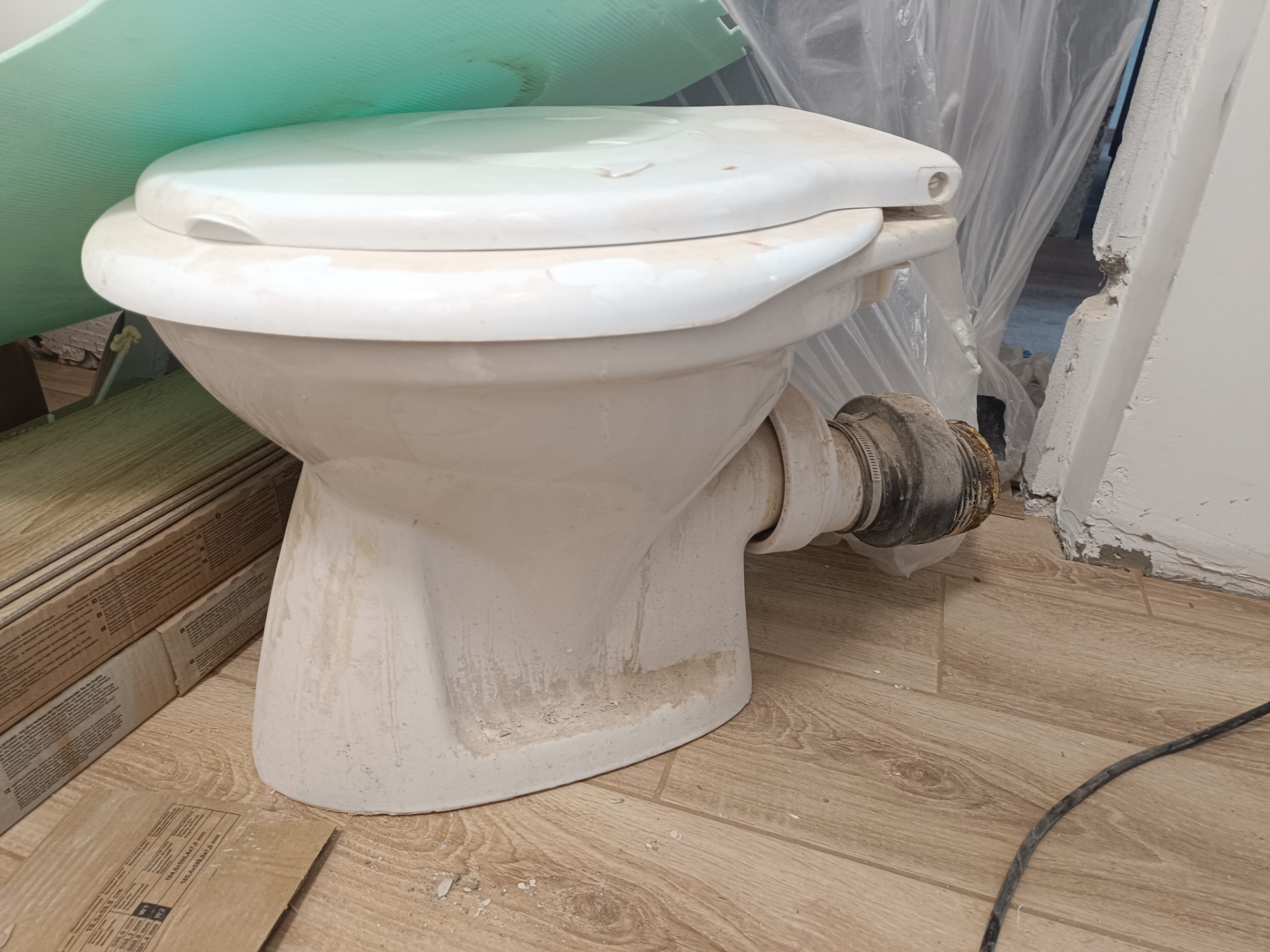 Az első kép, a kiszedett régi wc. Látható, hogy excenter és még egy excenter van összerakva, és a csőbe lamellákkal bedugva...