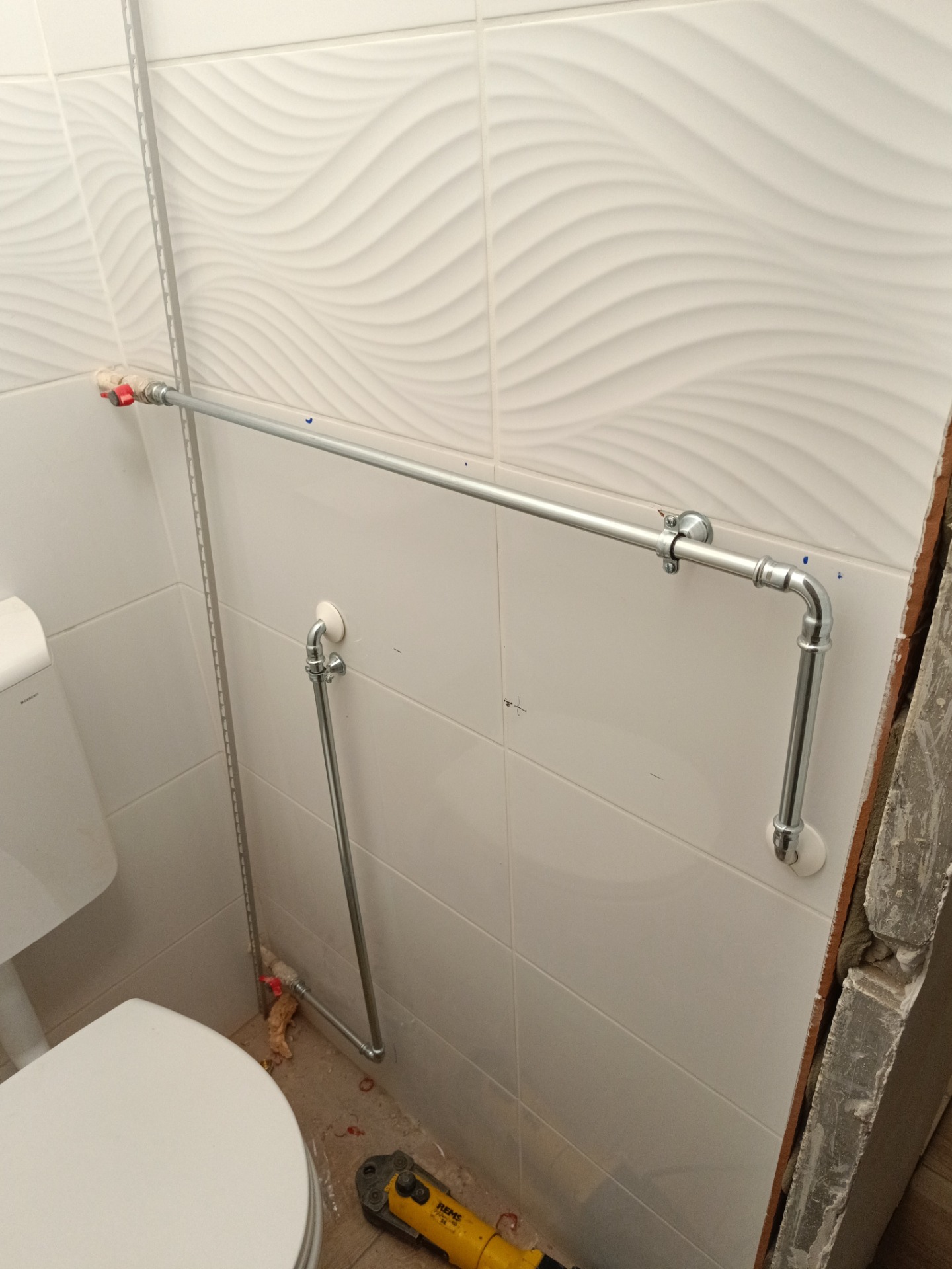 Első kép a wc-ben lévő cső átcsövezése a fürdőbe.